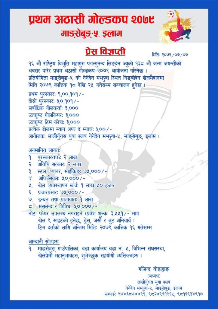 दमक (झापा)। राष्ट्रिय विभुती फाल्गुन्द लिङ्देनको १३८औँ शुभ जन्मोत्सवको अवसरमा इलामको माङसेबुङमा प्रथम अठासी गोल्डकप फुटबल प्रतियोगिता २०७९ आयोजना हुने भएको छ ।