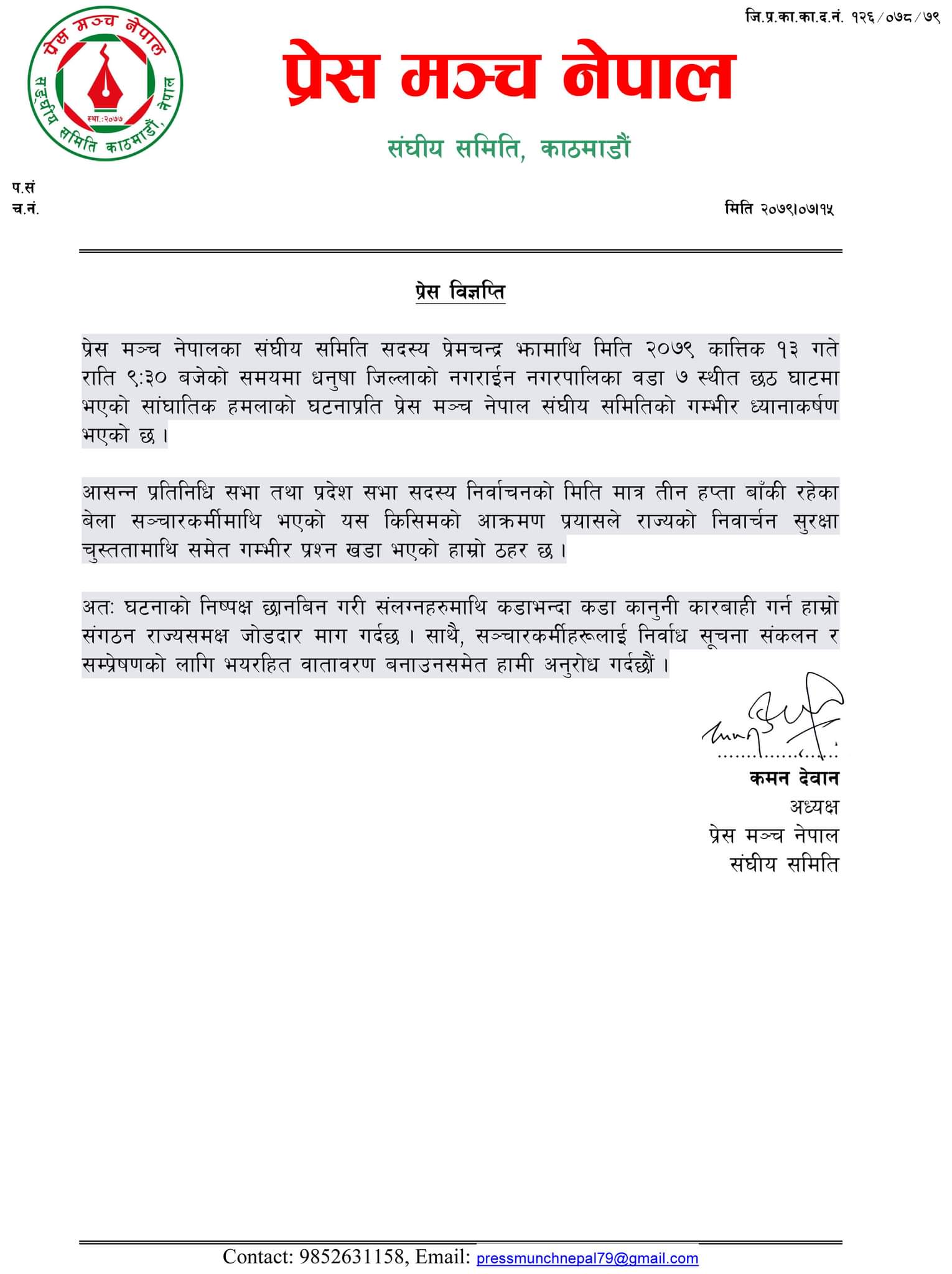 झालाई कात्तिक १३ गते राति ९ः३० बजेको समयमा धनुषा जिल्लाको नगराईन नगरपालिका वडा ७ स्थीत छठ घाटमा सांघातिक हमला भएको हो । विज्ञप्तिमा भनिएको छ –‘आसन्न प्रतिनिधि सभा तथा प्रदेश सभा सदस्य निर्वाचनको मिति मात्र तीन हप्ता बाँकी रहेका बेला सञ्चारकर्मीमाथि भएको यस किसिमको आक्रमण प्रयासले राज्यको निवार्चन सुरक्षा चुस्ततामाथि समेत गम्भीर प्रश्न खडा भएको हाम्रो ठहर छ ।’ प्रेस मञ्च नेपालले घटनाको निष्पक्ष छानबिन गरी संलग्नहरूमाथि कडाभन्दा कडा कानुनी कारबाही गर्न राज्यसमक्ष जोडदार माग पनि गरेको छ । सञ्चारकर्मीहरूलाई निर्वाध सूचना संकलन र सम्प्रेषणको लागि भयरहित वातावरण बनाउनसमेत प्रेस मञ्चले अनुरोध गरेको छ ।