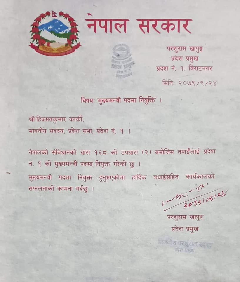विराटनगर । प्रदेश प्रमुख परशुराम खापुङले एमाले नेता हिक्मतकुमार कार्कीलाई आइतबार मुख्यमन्त्रीमा नियुक्त गरेका छन् । प्रदेश १ को मुख्यमन्त्रीमा एमाले संसदीय दलका नेता समेत रहेका ५८ वर्षीय हिक्मतकुमार कार्की नियुक्तलाई गरेका हुन् ।