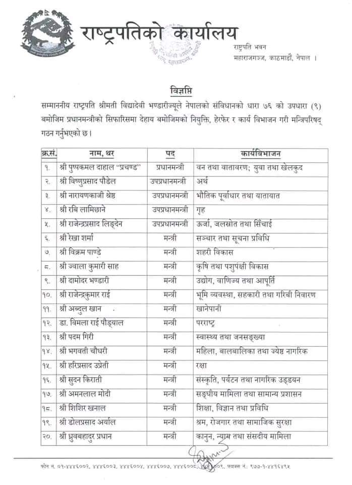 काठमाडौँ । प्रधानमन्त्री प्रचण्डले मंगलबार १२ मन्त्री र ३ राज्यमन्त्री थप्दै २३ सदस्यीय मन्त्रिमण्डल बनाएका हुन् । मंगलबार उपप्रधानमन्त्री तथा ऊर्जामन्त्री राजेन्द्र लिङ्देनसहित १२ मन्त्री र २ राज्यमन्त्रीले शपथग्रहण गरेका छन् । लिङ्देन राप्रपाका अध्यक्षसमेत हुन। माओवादीबाट रेखा शर्मा सूचना, सञ्चार तथा प्रविधिमन्त्री र अमनलाल मोदी संघीय मामिला तथा सामान्य प्रशासनमन्त्री भएका छन् । सुदन किराती पर्यटन तथा नागरिक उड्ययनमन्त्री र सुशीला श्रीपाली पर्यटन राज्यमन्त्री भएकी छन् ।