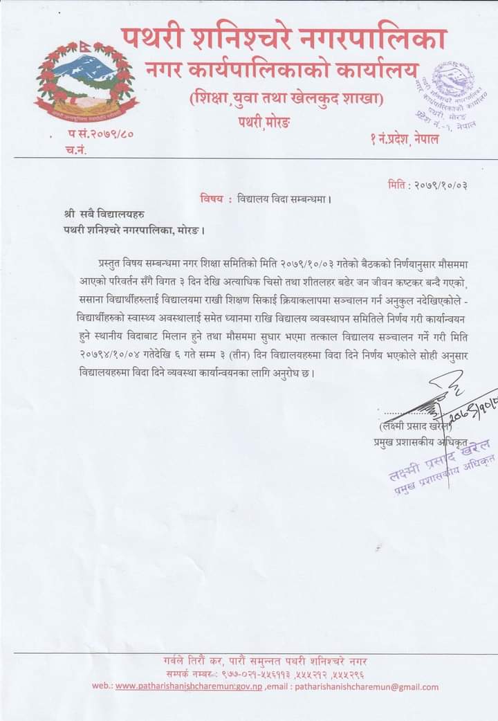 पथरी । मोरङको पथरी शनिश्चरे नगरपालिकाको सबै बिद्यालय बन्द गरिएको छ । आज बसेको नगर शिक्षा सामितिको बैठकले माघ ४ गतेदेखि ६ गतेसम्म बिद्यालय बन्द गर्ने निर्णय गरेको हो । तीनदिन देखि चिसो बढेकोले शिक्षण सिकाइ क्रियाकलाप गर्न अनुकुल नदेखिएकाले बिद्यालय बन्द गरेको नगरपालिकाले जनाएको छ ।