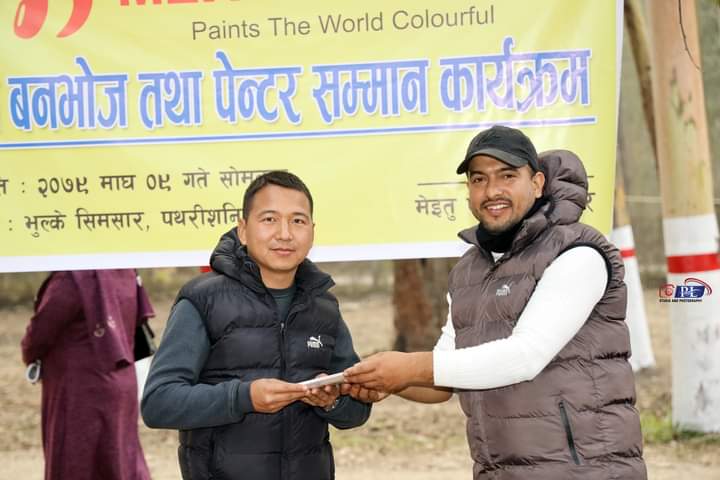 पथरी । मेइतु पेन्टसले आफ्नो ग्राहक र पेन्टसहरुलाई सोमबार सम्मान गरेको छ । शान्ति सिमसार पथरी शनिश्चरेमा बनभोज र पेटस सम्मान कार्यक्रमको आयोजना गरि सम्मान गरेको हो । यसरी पुरस्कृत हुनेमा ग्राहकको तर्फबाट लाफा वचत तथा सहकारी सस्था लि. र पेन्टरको तर्फबाट हिमाल लिम्बू रहेका छन । पेन्टर लिम्बुलाई ३२ इन्चको टिभी र ग्राहक लाफा सहकारीलाई फ्रीज वितरण गरिएको थियो । लक्की ड्रमार्फत छनोट गरिएको पुरस्कारहरु मेइतु पेन्टसका संचालक ऋषि चम्लगाईलगायतले वितरण गरेका थिए । ३२ पेन्टरहरुलाई ट्राक सुट प्रदान गरेको थियो । कार्यक्रममा हाडी फोर र म्युजिकल चेयर स्पर्धा गरेको थियो । हाडी फोरमा हिमाल लिम्बु र म्युजिकल चेयरमा अरुणा राई प्रथम भए।