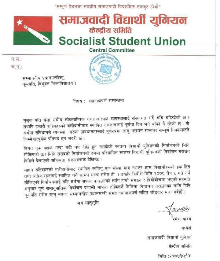 काठमाडौँ । जनता समाजवादी पार्टी नेपाल निकट समाजबादी विद्यार्थी युनियनले स्वतन्त्र विद्यार्थी युनियनको निर्वाचन पूर्ण समानुपातिक निर्वाचन प्रणालीमार्फत गर्नुपर्ने माग राख्दै प्रधानमन्त्री पुष्पकमल दाहाल ‘प्रचण्ड’लाई ध्यानाकर्षणपत्र बुझाएको छ । शनिबार समाजवादी विद्यार्थी युनियनका प्रतिनिधिहरुको टोलीले प्रधानमन्त्रीलाई भेटी ध्यानाकर्षण पत्र बुझाएको हो । पत्रमा भनिएको छ `त्रिविले मिति २०७९ चैत्र ५ गते गर्न तोकिएको निर्वाचनलाई सहि अर्थमा सफल बनाउनको लागि हाम्रो संगठन र त्रिवीबीचमा भएको सहमति अनुसार पूर्ण समानुपातिक निर्वाचन प्रणाली मार्फत तोकिएकै मितिमा निर्वाचन गराउनका लागि त्रिवि कुलपति समेत रहनु भएका सम्माननीय प्रधानमन्त्री समक्ष युनियनका ध्यानाकषर्ण सहित जोडदार माग गर्दछौं।´