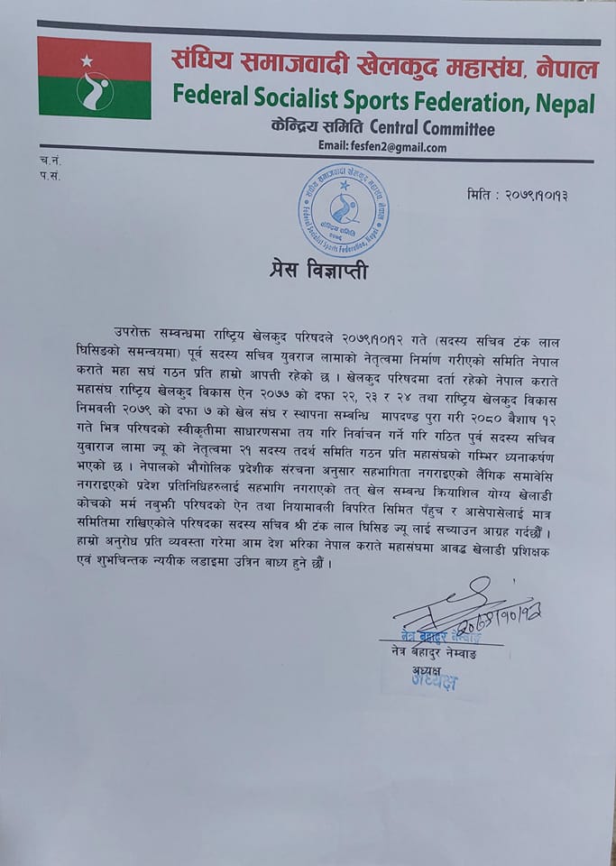 पथरी । संघीय समाजबादी खेलकुद महासंघ नेपालले नेपाल कराते महासंघ गठन भएको प्रति विमत्ति जनाएको छ । माघ १२ गते राष्ट्यि खेलकुद परिषद्का सदस्य सचिब टंकलाल घिसिङको समन्वयमा पूर्व सदस्य सचिब युवराज लामाको नेतृत्वमा २१ सदस्यीय कराते महासंघ गठन भएको थियो । भौगोलिक संरचनाअनुसार सहभागिता नगराएको, लैंगिक समावेशिता नगराएको, क्रियाशिल योग्य खेलाडी कोचको मर्म नबुझी परिषद्को ऐन, नियमावलीको विपरीत सीमित पहुँच र आसेपासेलाई मात्र समितिमा राखेको महासंघले आपत्ति जनाएको छ । परिषद्लाई सच्याउन आग्रह गरेको छ । महासंघका अध्यक्ष नेत्रबहादुुर नेम्वाङले विज्ञप्ती जारी गर्दै लामा नेतृत्वको कराते महासंघलाई परिषद्ले नसच्चाए न्यायीय लडाई लडने चेतावनी दिएका छन् ।