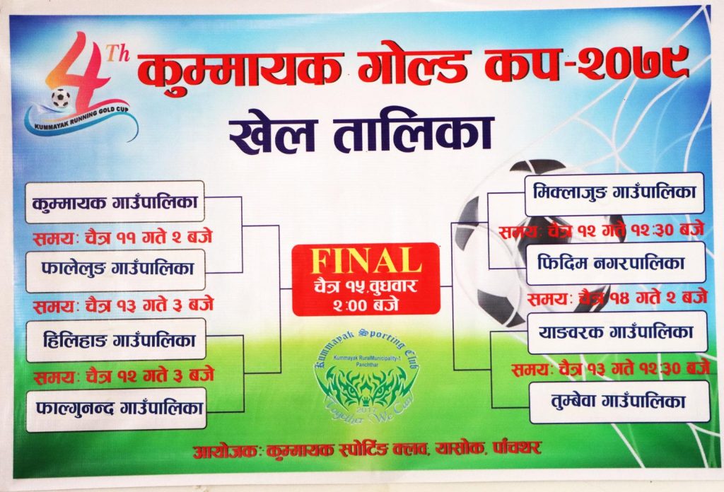 कुम्मायक(पाँचथर) । कुम्मायक स्पोर्टिङ क्लबको आयोजनामा पाँचथरको कुम्मायक गाउँपालिकामा संचालन हुदैँ आएको कुम्मायक गोल्डकप चैत ११ गतेदेखि हुने भएको छ । बुधवार पालिकाको केन्द्र यासोकमा पत्रकार सम्मेलन गर्दै आगामी चैत्र ११ गतेदेखि १५ गतेसम्म गोल्डकपको चौथो संस्करण हुने आयोजकले जानकारी दिएको छ। प्रतियोगितामा पाँचथरका ८ वटै स्थानीय तहको सहभागिता रहने छ ।