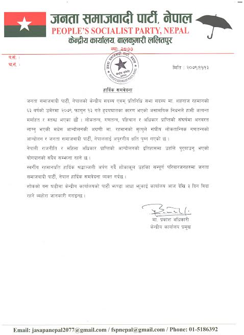 शोकमा जसपाले पार्टीको झण्डा आधा झुकाउने र आजदेखि ३ दिनसम्म कार्यालय बन्द रहने बताएको छ।