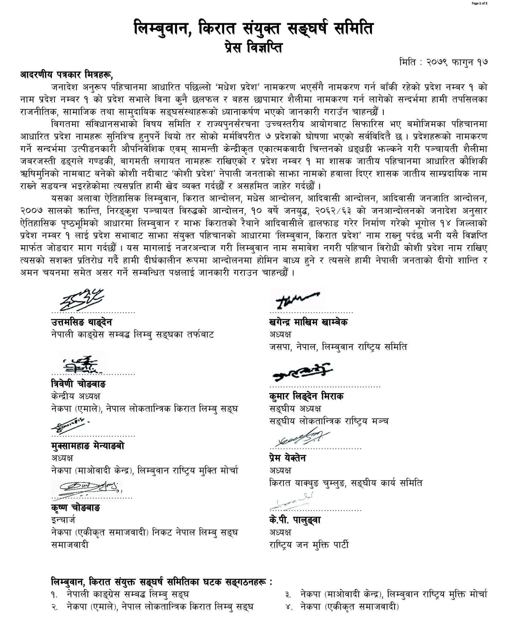 यसका अलावा ऐतिहासिक लिम्बुवान, किरात आन्दोलन, मधेस आन्दोलन, आदिवासी आन्दोलन, आदिवासी जनजाति आन्दोलन, २००७ सालको क्रान्ति, निरङ्कुश पञ्चायत विरुद्धको आन्दोलन, १० वर्षे जनयुद्ध, २०६२/६३ को जनआन्दोलनको जनादेश अनुसार ऐतिहासिक पृष्ठभूमिको आधारमा लिम्बुवान र माझ किरातको रैथाने आदिवासीले ढालफाड गरेर निर्माण गरेको भूगोल १४ जिल्लाको प्रदेश नम्बर १ लाई प्रदेश सभाबाट साझा संयुक्त पहिचानको आधारमा ‘लिम्बुवान, किरात प्रदेश’ नाम राख्नु पर्दछ भनी यसै विज्ञप्ति मार्फत जोडदार माग गर्दछौँ । यस मागलाई नजरअन्दाज गरी लिम्बुवान नाम समावेश नगरी पहिचान विरोधी कोशी प्रदेश नाम राखिए त्यसको सशक्त प्रतिरोध गर्दै हामी दीर्घकालीन रूपमा आन्दोलनमा होमिन बाध्य हुने र त्यसले हामी नेपाली जनताको दीगो शान्ति र अमन चयनमा समेत असर गर्ने सम्बन्धित पक्षलाई जानकारी गराउन चाहन्छौँ ।
