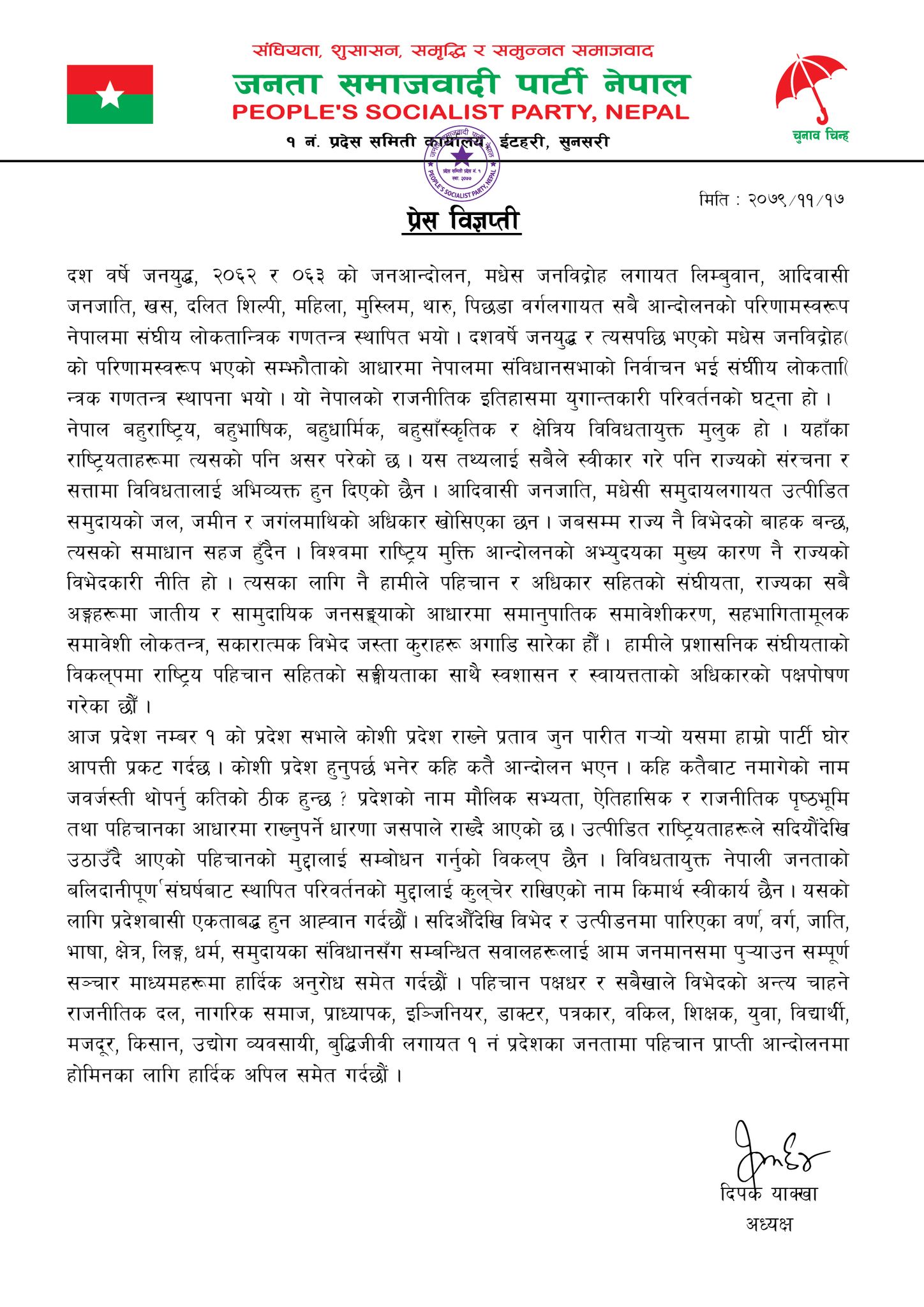 प्रदेशको नामाकरण ‘किरात-लिम्बुवान-मधेस-शेपालुङ’ हुनुपर्ने माग राख्दै आएको स्मरण गर्दै परिवर्तनबाट स्थापित मुद्दाहरूलाई रक्षा गर्न विगतमा आदिवासी जनजाति आन्दोलन, लिम्बुवान, थरूहट/थारूवान, ताम्सालिङ, किरात-खम्बुवान आन्दोलनलगायतसँग गरेका सम्झौताहरू कार्यान्वयन गर्नका लागि प्रदेशबासी एकताबद्ध हुन जसपाले आह्वान गरेको छ ।