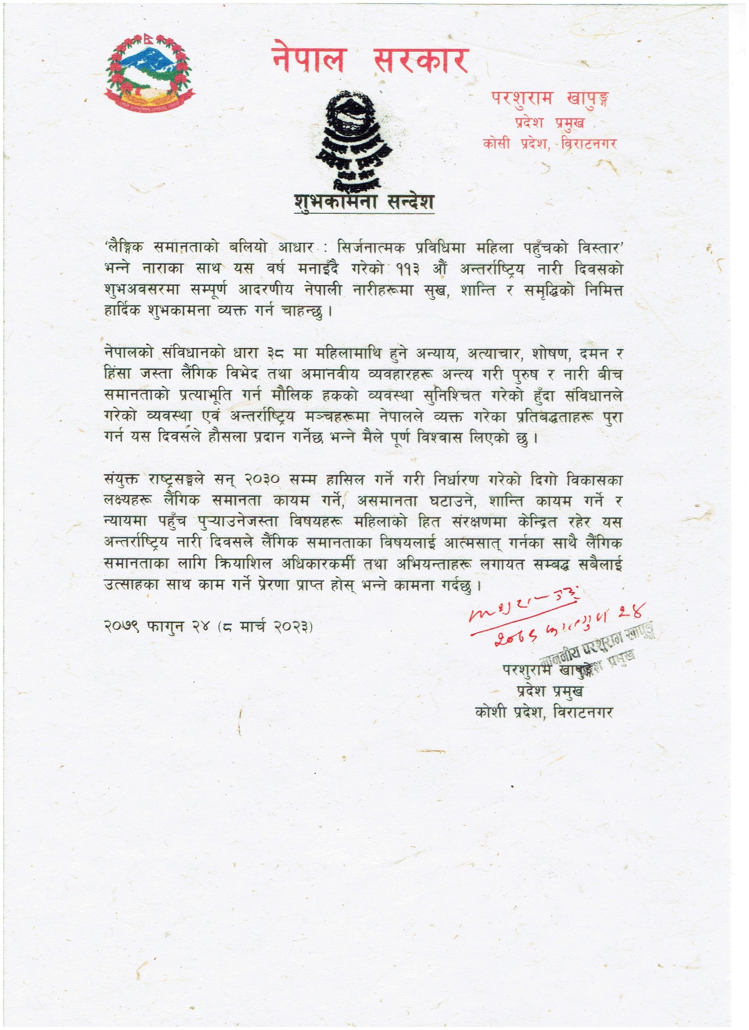 त्यसैगरी नेपालको संविधानको धारा ३८ मा महिलामाथि हुने अन्याय, अत्याचार, शोषण, दमन र हिंसा जस्ता लैंगिक विभेद तथा अमानवीय व्यवहारहरू अन्त्य गरी पुरुष र नारी बीच समानताको प्रत्याभूति गर्न मौलिक हकको व्यवस्था सुनिश्चित गरेको हुँदा संविधानले गरेको व्यवस्था एवं अन्तर्राष्ट्रिय मञ्चहरूमा नेपालले व्यक्त गरेका प्रतिबद्धताहरू पुरा गर्न यस दिवसले हौसला प्रदान गर्नेछ भन्ने प्रदेश प्रदेश प्रमुखले विश्वास लिएको शुभकामना सन्देशमा जनाएका छन् । संयुक्त राष्ट्रसङ्घले सन् २०३० सम्म हासिल गर्ने गरी निर्धारण गरेको दिगो विकासका लक्ष्यहरू लैंगिक समानता कायम गर्ने, असमानता घटाउने, शान्ति कायम गर्ने र न्यायमा पहुँच पुर्याउनेजस्ता विषयहरू महिलाको हित संरक्षणमा केन्द्रित रहेर यस अन्तर्राष्ट्रिय नारी दिवसले लैंगिक समानताका विषयलाई आत्मसात् गर्नका साथै लैंगिक समानताका लागि क्रियाशिल अधिकारकर्मी तथा अभियन्ताहरूलगायत सम्बद्ध सबैलाई उत्साहका साथ काम गर्ने प्रेरणा प्राप्त होस् भन्ने कामना पनि प्रदेश प्रमुखले गरे ।