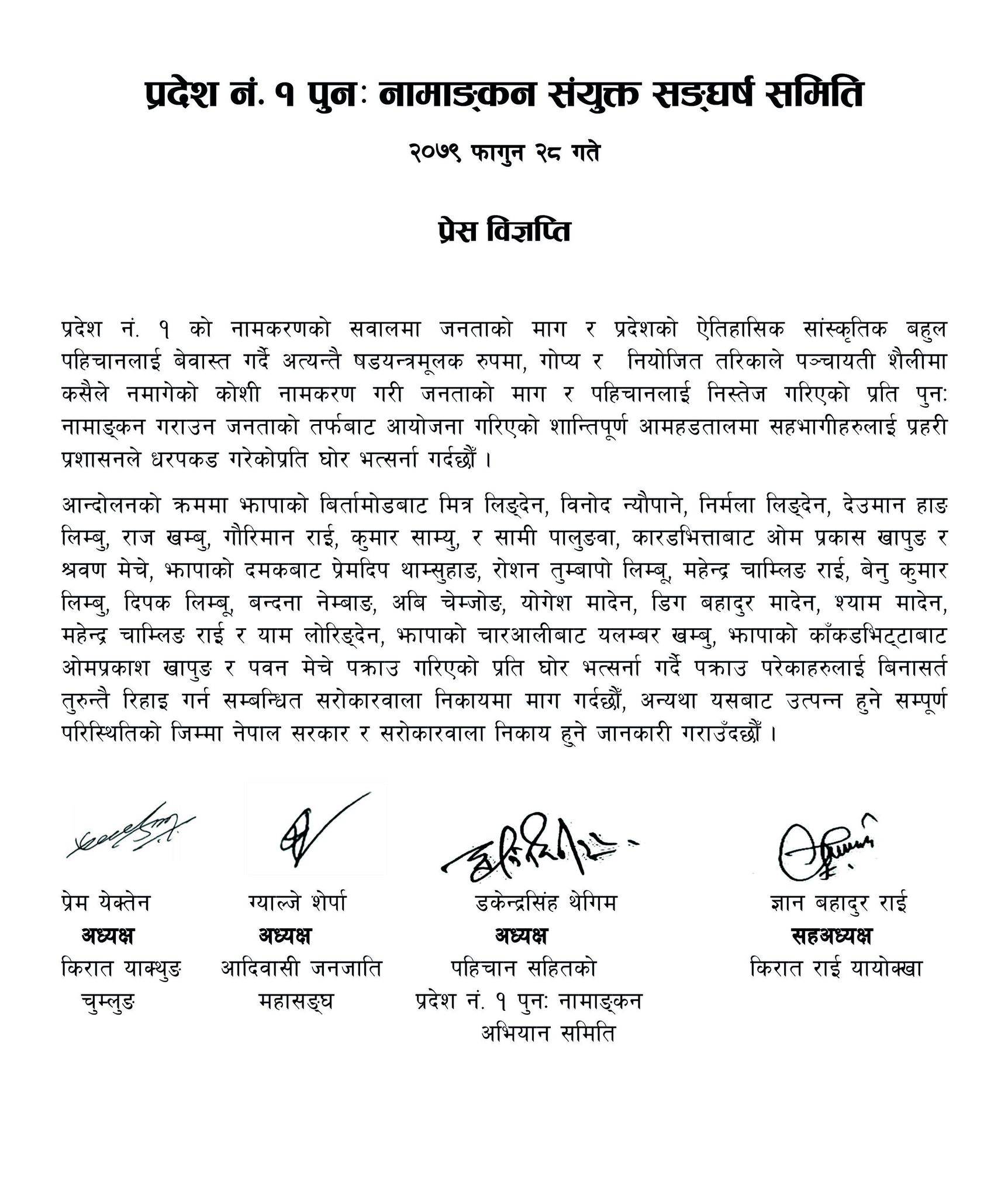 आन्दोलनको क्रममा झापाको बिर्तामोडबाट मित्र लिङ्देन, विनोद न्यौपाने, निर्मला लिङ्देन, देउमान हाङ लिम्बु, राज खम्बु, गौरिमान राई, कुमार साम्यु, र सामी पालुङवा, झापाको दमकबाट प्रेमदिप थाम्सुहाङ, रोशन तुम्बापो लिम्बू, महेन्द्र चाम्लिङ राई, बेनु कुमार लिम्बु, दिपक लिम्बू, बन्दना नेम्बाङ, अबि चेम्जोङ, योगेश मादेन, डिग बहादुर मादेन, श्याम मादेन, महेन्द्र चाम्लिङ राई र याम लोरिङ्देन, झापाको चारआलीबाट यलम्बर खम्बु, झापाको काँकडभिट्टाबाट ओमप्रकाश खापुङ र पवन मेचे पक्राउ गरिएको समितिले जनाएको छ । भर्खरै प्राप्त जानकारी अनुसार केर्खा बजारबाट ममता लिम्बू साम्योक आङ्देम्बे र दिलिप घताने पनि पक्राउ परेका छन् । घटनाको घोर भत्सर्ना गर्दै पक्राउ परेकाहरुलाई बिनासर्त तुरुन्तै रिहाइ गर्न सम्बन्धित सरोकारवाला निकायमा माग गर्दै समितिले अन्यथा यसबाट उत्पन्न हुने सम्पूणर् परिस्थितिको जिम्मा नेपाल सरकार र सरोकारवाला निकाय जिम्मेवार हु्ने जानकारी गराएको छ ।