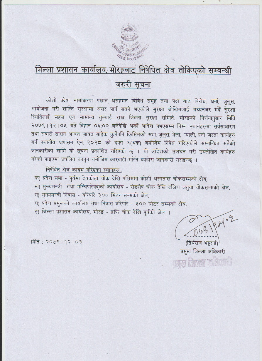 आज प्रमुख जिल्ला अधिकारी भट्टराईले जरुरी सूचना जारी गर्दै कोशी प्रदेश नामाकरण पश्यात असहमत विविध समूह तथा पक्षबाट विरोध, धर्ना जुलुस आयोजना गरी शान्ति सुरक्षामा असर पार्न सक्ने भएकाले सुरक्षा जोखिमलाई मध्यनगर गर्दै निशेधित क्षेत्र तोकिएको हो । चैत ५ गते विहान ६ वजेदेखि अर्को आदेश नभएसम्म कुनै पनि सभा जुलुस, भेला, धर्नाजस्ता कार्यहरु गर्न स्थानीय प्रशासन ऐन २०२८ को दफा ६(३क) बमोजिम निषेध गरिएकोले प्रशासनले जनाएको छ ।