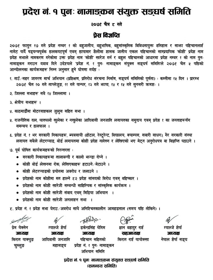 षड्यन्त्रपूर्वक छलकपटपूणर् एवम् छापामार शैलीमा शासक जातीय एकल पहिचानको साम्प्रदायिक ‘कोशी’ प्रदेश नाम प्रदेश सभाले नामकरण गरेकोमा प्रदेश नाम ‘कोशी’ खारेज गर्न र बहुल पहिचानको आधारमा प्रदेश नम्बर १ को नाम पुनः नामाङ्कन गराउन दबाब दिने उद्देश्यले आन्दोलनको कार्यक्रम सार्वजनिक गरेको हो । विज्ञप्तिमा गाउँ/सहर जागरण मार्च अभियान (प्रशिक्षण, प्रतिरोध संरचना निर्माण, सङ्घर्ष समितिको पूणर्ता), १४ जिल्ला/क्षेत्रीय सभाहरु, काठमाडौँमा मोटरसाइकल जुलुस, राजनीतिक दल, थातथलो खुलेका र नखुलेका आदिवासी जनजाति लगायतका समुदाय एवम् प्रदेश १ का जनताहरुसँग समन्वय र छलफल गर्ने भनिएको छ । प्रदेश नं. १ भर सरकारी निकायहरु, व्यवसायी (होटल, रेस्टुरेन्ट, विद्यालय, क्याम्पस, सवारी साधन), गैर सरकारी संस्था लगायत सबैले लेटरप्याड, बोर्ड लगायतमा कोशी प्रदेश नलेख्न र लेखिएको भए मेट्न अनुरोधपत्र वा विज्ञप्ति पठाउने र पूर्व घोषित कार्यक्रमहरुको निरन्तरता दिने संघर्ष समितिले जनाएको छ ।