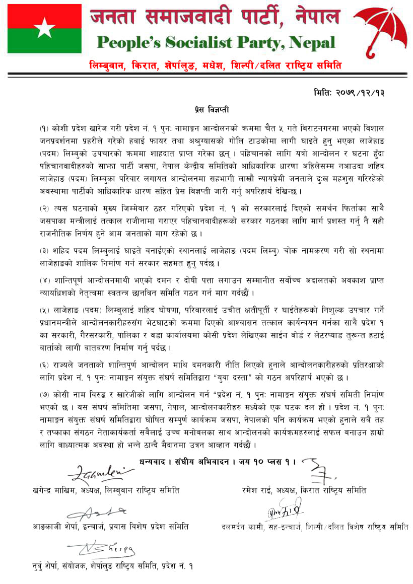 (१) कोशी प्रदेश खारेज गरी प्रदेश नं. १ पुन: नामाङ्कन आन्दोलनको क्रममा चैत ५ गते बिराटनगरमा भएको विशाल जनप्रदर्शनमा प्रहरीले गरेको हवाई फायर तथा अश्रुग्यासको गोलि टाउकोमा लागी घाइते हुनु भएका लाजेहाङ (पदम) लिम्बुको उपचारको क्रममा शाहदात प्राप्त गरेकाछन् । पहिचानको लागि यत्रो आन्दोलन र घटना हुँदा पहिचानवादीहरुको साझा पार्टी जसपा, नेपाल केन्द्रीय समितिको आधिकारिक धारणा अहिलेसम्म नआउदा शहिद लाजेहाङ (पदम) लिम्बुका परिवार लगायत आन्दोलनमा सहभागी लाखौ न्यायप्रेमी जनताले दु:ख महशुस गरिरहेको अवस्थामा पार्टीको आधिकारिक धारण सहित प्रेस विज्ञप्ती जारी गर्नु अपरिहार्य देखिन्छ ।