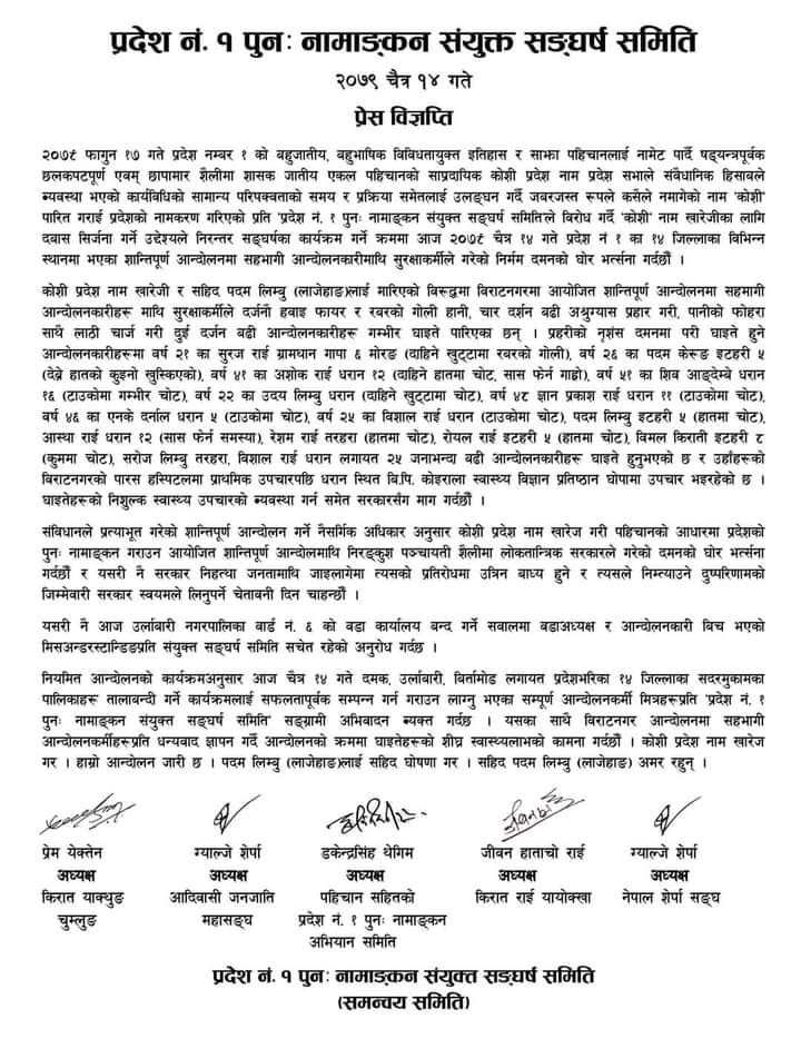 मङ्गलबार प्रेस विज्ञप्ति जारी गर्दै ‘कोशी’ नाम खारेजीका लागि दबास सिर्जना गर्ने उद्देश्यले समितिले निरन्तर सङ्घर्षका कार्यक्रम गर्दै आएको छ ।