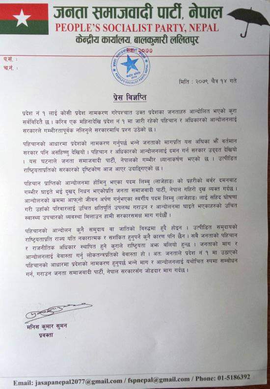 प्रदेश नं १ मा उठाएको पहिचानको आधारमा प्रदेशको नामकरण हुनुपर्ने जनाएको छ । “पहिचानको आन्दोलन कुनै समुदाय वा जातिको विरुद्धमा हुँदै होइन । उत्पीडित समुदायको राष्ट्रियताप्रति राज्य यति नकारात्मक र सशंकित हुनुपर्ने कुनै कारण पनि छैन । सबै जनताको पहिचान र राजनीतिक अधिकार स्थापित हुने कुराले राष्ट्रियता अझ बलियो हुन्छ । जनताको माग र आन्दोलनलाई बेवास्ता गर्नु लोकतन्त्रप्रतिको बेवास्ता हो,” विज्ञप्तिमा भनिएको छ, “अतः जनताले प्रदेश नं १ मा उठाएको पहिचानको आधारमा प्रदेशको नामकरण हुनुपर्छ भन्ने माग र आन्दोलनलाई यथोचित रुपमा सम्बोधन गर्न, गराउन जनता समाजवादी पार्टी, नेपाल सरकारसँग जोडदार माग गर्दछ ।”