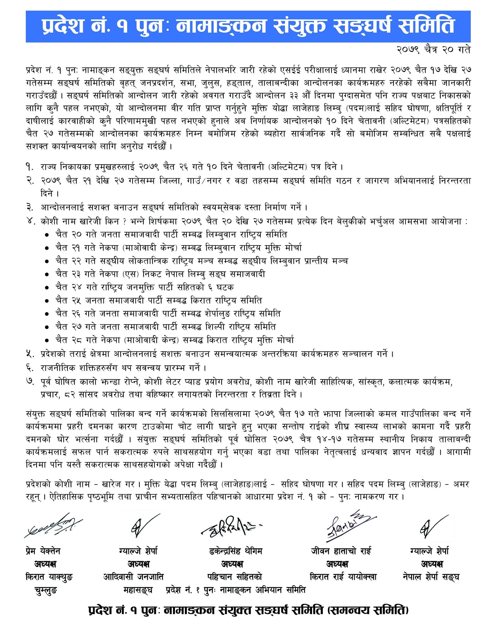 सोमबार विज्ञप्ति जारी गर्दै समितिले भनेको छ, ‘२०७९ चैत १७ देखि २७ गतेसम्म सङ्घर्ष समितिको वृहत जनप्रदर्शन, सभा, जुलुस, हड्ताल, तालाबन्दीका आन्दोलनका कार्यक्रमहरु नरहेको सबैमा जानकारी गराउँदछौँ ।’ आन्दोलन ३३ औँ दिनमा पुग्दासमेत पनि राज्य पक्षबाट निकासको लागि कुनै पहल नभएको प्रति संघर्ष समिति रुष्ट छ । आन्दोलनमा वीर गति प्राप्त गरेको जनाउँदै समितिले मुक्ति योद्धा लाजेहाङ लिम्बु (पदम)लाई सहिद घोषणा, क्षतिपूर्ति र दाषीलाई कारवाहीको कुनै परिणाममुखी पहल नभएको हुनाले अब निर्णायक आन्दोलनको १० दिने चेतावनी (अल्टिमेटम) दिने जनाएको छ ।