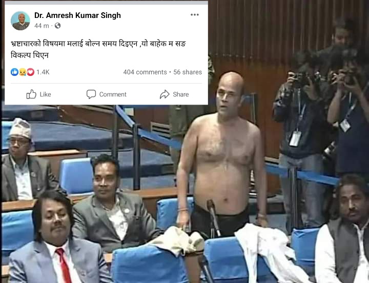 काठमाडौ । सोमबार दिउँसो प्रतिनिधिसभा सदस्य डा.अमरेशकुमार सिंहले संसद्मा कपडा खोलेका छन । सभामुख देवराज घिमिरेले सभ्यताका साथ आफ्ना कुराहरू राख्न चेतावनी दिए । विशेष समय नछुट्याई सभामुख घिमिरेले नियमित कारबाहीमा जान्छौं भनेपछि उनले कपडा खोलेर विरोध जनाएका थिए । त्यसपछि सांसद सिंह अहिले बैठकस्थलबाट बाहिए । बाहिर निस्केपछि घटनाको बिसयमा समाजिक संजालमा लेखेका छन्, `भ्रष्टाचारको विषयमा मलाई बोल्न समय दिइएन, यो बाहेक मसङग विकल्प थिएन।´