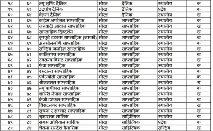 मोरङको पत्रपत्रिकाको वर्गीकरण कस्तो आयो?