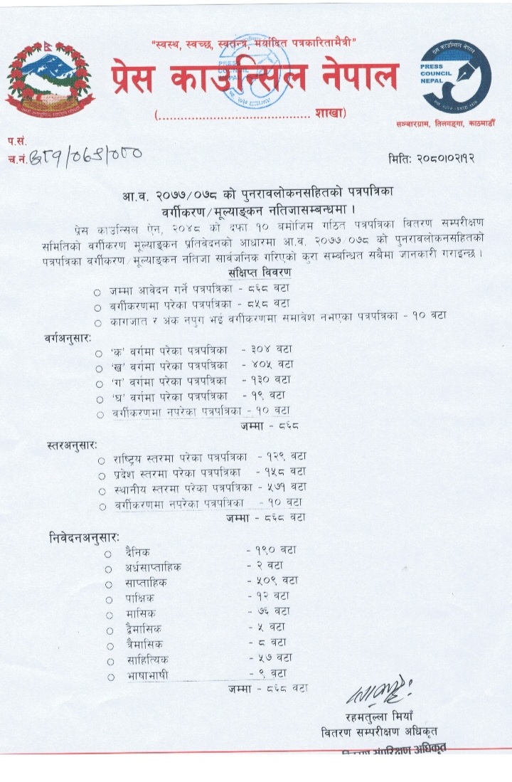 पथरी । प्रेस काउन्सिल नेपालले आर्थिक वर्ष २०७७/०७८ को पत्रपत्रिकाको वर्गीकरणको नतिजा सार्वजनिक गरेको छ ।