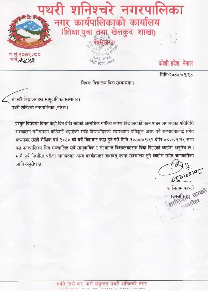 पथरी । केहि दिनदेखि अत्यधिक गर्मी बढेकाले पठनपाठनमा समस्या आएकाले पथरी शनिश्चरे नगरपालिकाले बिदा दिएको छ । बर्खे बिदा कट्टा हुने गरी जेठ १९ गतेदेखी २१ गतेसम्म सामुदायिक तथा सस्थागत बिद्यालय बिदा दिइएको हो ।
