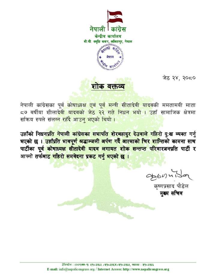 उनको निधनप्रति नेपाली कांग्रेसका सभापति शेरबहादुर देउवाले गहिरो दुःख व्यक्त गरेका छन् ।