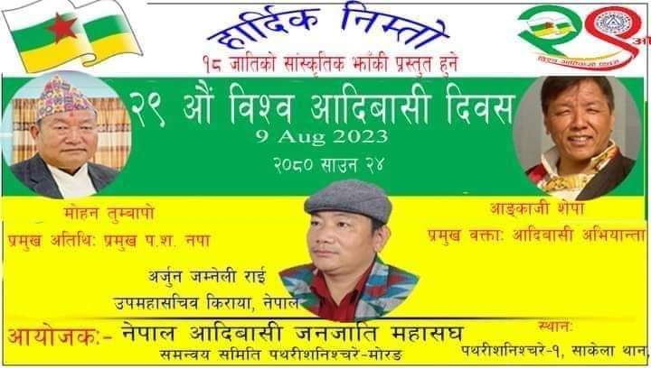 पथरी । अन्तर्राष्ट्रिय आदिवासी जनजाति दिवस आज विभिन्न कार्यक्रम गरी मनाइँदै छ । सातै प्रदेशका ग्रामीण तथा सहरी भेगमा उल्लासका साथ आदिवासी संघसंगठनको अगुवाइमा दिवस मनाउने चलन छ । पथरीमा हुने कार्यक्रममा पथरी शनिश्चरे नगरपालिकाका प्रमुख मोहन तुम्बापो, आदिवासी जनजातिका अगुवा आङ्काजी शेर्पा `किसान´, किरात राई यायोख्खाका उपमहासचिव अर्जुन जम्नेली राईले सम्बोधन गर्ने वताइएको छ।