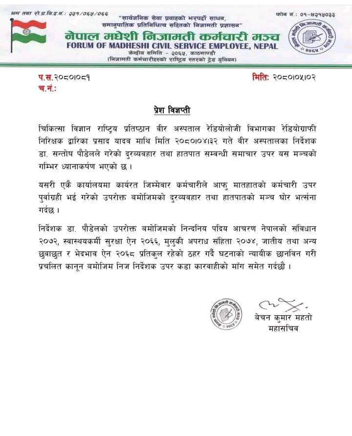 वीर अस्पताल रेडियोलोजी बिभागका रेडियोग्राफी निरीक्षक द्वारिका प्रसाद यादबमाथि हातपात र दुर्ववहार गरेको खवर प्रति ध्यानाकर्षण भएको भन्दै सरोकारवाला सस्थाहरुले कार्वाहीको माग गरेको हो ।नेपाल मधेसी निजामती कर्मचारी मंच,  नेपाल रेडियोलोजिकल सोसाइटी र मधेसी स्वास्थ्यकर्मी फोरम, नेपालले डा. पौडेलको ज्यादति बढ्दै गएको भन्दै कारबाहीको माग गरेका हुन् । डा. पौडेलमाथि वीर अस्पतालमा कार्यरत विभिन्न शाखा कर्मचारीहरुलाई विगतदेखि नै गालीगलोच र अपशब्द भन्दै आइरहेको आरोप लाग्दै आएको छ ।  यसअघि ट्रमा सेन्टरको निर्देशक हुँदा पनि कर्मचारीलाई गालिगलोज गर्ने धम्काउने , अपशब्द प्रयोग गर्ने जस्ता कार्य गरेको भन्दै उजुरी परेको थियो ।