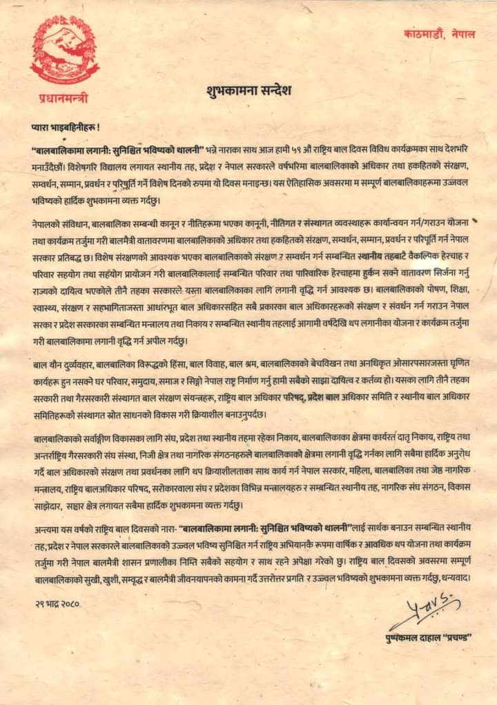 विशेषगरि विद्यालय लगायत स्थानीय तह, प्रदेश र नेपाल सरकारले वर्षभरिमा बालबालिकाको अधिकार तथा हकहितको संरक्षण, सम्वर्धन, सम्मान, प्रवर्धन र परिषूर्ति गर्ने विशेष दिनको रुपमा यो दिवस मनाइन्छ। यस ऐतिहासिक अवसरमा प्रधानमन्त्री पुष्पकमल दाहालले बालबालिकाहरूमा उज्जवल भविष्यको हार्दिक शुभकामना व्यक्त गरेका छन् । `नेपालको संविधान, बालबालिका सम्बन्धी कानून र नीतिहरूमा भएका कानूनी, नीतिगत र संस्थागत व्यवस्थाहरू कार्यान्वयन गर्न/गराउन योजना तथा कार्यक्रम तर्जुमा गरी बालमैत्री वातावरणमा बालबालिकाको अधिकार तथा हकहितको संरक्षण, सम्वर्धन, सम्मान, प्रवर्धन र परिषूर्ति गर्न नेपाल सरकार प्रतिबद्ध छ।´ शुभकामना सन्देश लेखिएको छ, `विशेष संरक्षणको आवश्यक भएका बालबालिकाको संरक्षण र सम्वर्धन गर्न सम्बन्धित स्थानीय तहबाटै वैकल्पिक हेरचाह र परिवार सहयोग तथा सहयोग प्रायोजन गरी बालबालिकालार्इ सम्बन्धित परिवार तथा पारिवारिक हेरचाहमा हुर्कन सक्ने वातावरण सिर्जना गर्नु राज्यको दायित्व भएकोले तीनै तहका सरकारले यस्ता बालबालिकाका लागि लगानी वृद्धि गर्न आवश्यक छ।´ बालबालिकाको पोषण, शिक्षा, स्वास्थ्य, संरक्षण र सहभागिताजस्ता आधारभूत बाल अधिकारसहित सबै प्रकारका बाल अधिकारहरूको संरक्षण र संवर्धन गर्न गराउन नेपाल सरका र प्रदेश सरकारका सम्बन्धित मन्त्रालय तथा निकाय र सम्बन्धित स्थानीय तहलार्इ आगामी वर्षदेखि थप लगानीका योजना र कार्यक्रम तर्जुमा गरी बालबालिकामा लगानी वृद्धि गर्न उनले अपील गरे ।