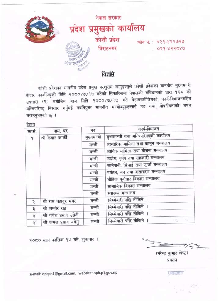 एमालेको असहमतिका बाबजुद कोशी प्रदेशका मुख्यमन्त्री केदार कार्कीले मन्त्रीमण्डल विस्तार गरेको बताइएको छ। गत असोज २७ गते कार्की मुख्यमन्त्रीमा नियुक्त भए । सो को भोलिपल्ट मन्त्रिपरिषदमा एमालेबाट रामबहादुर राना मगर र काँग्रेसका शम्शेर राईलाई मन्त्री नियुक्त गरेका हुन् । चारै मन्त्रीहरुको कार्यविभाजन भने अझै भएको छैन । आइतबारसम्ममा जिम्मेवारी तोकिने गठबन्धन दलका नेताहरुले बताएका छन् ।
