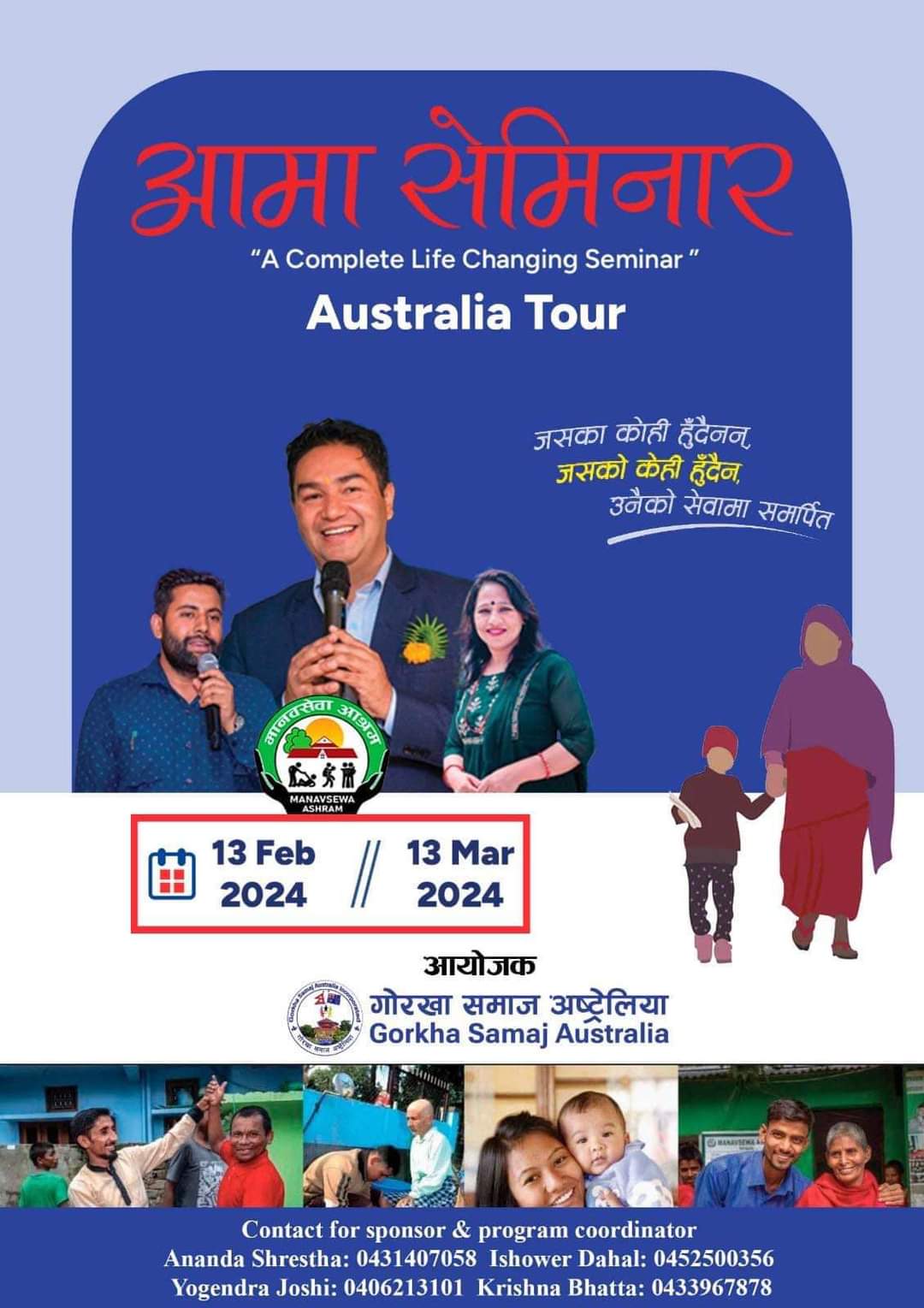 अष्ट्रेलिया । गोरखा समाज अष्ट्रेलियाको आयोजनामा मानव सेवा आश्रमले अष्टेलियामा आमा सेमिनार गर्ने भएको छ ।