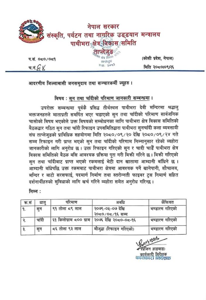 २०७९ साल भदौ ७ गतेदेखि २०८० साल मंसिर १६ गतेसम्मको उक्त सु भण्डारण गरिएको कार्यकारी निर्देशक प्रजिन हाङवाङले जनाए । पाथीभरा क्षेत्र विकास समितिको बैठकले निर्णय गरेर नेपाल सुनचाँदी व्यवसायी सँघसँग समन्वय गरेर पुस २० गतेदेखि २४ गतेसम्म रिफाइन गरेको हो । ८६ तोला ९३ लाल सुन यसअघिको रिफाइन गरि भण्डार गरिएको थियो । त्यस्तै ६१ किलो ८ सय ग्राम चाँदी रिफाईन गरि भण्डारण गरेको छ । चाँदी २०७६ सालदेखि २०८० मंसिर १६ गतेसम्मको हो । भण्डार गरेको सुन र चाँदी आवश्यक प्रक्रिया पुरा गरेर विक्री गर्ने कार्यकारी निर्देशक प्रजिन हाङवाङले हस्ताक्षर गरेको विज्ञप्तीमा उल्लेख गरिएकोछ । विक्रीबाट प्राप्त आम्दानी आगन्तुक भक्तजनलाई सुविधा पुग्ने गरि भैतिक संरचना निर्माणमा खर्च गरिने बिकास समितिको भनाइ छ ।