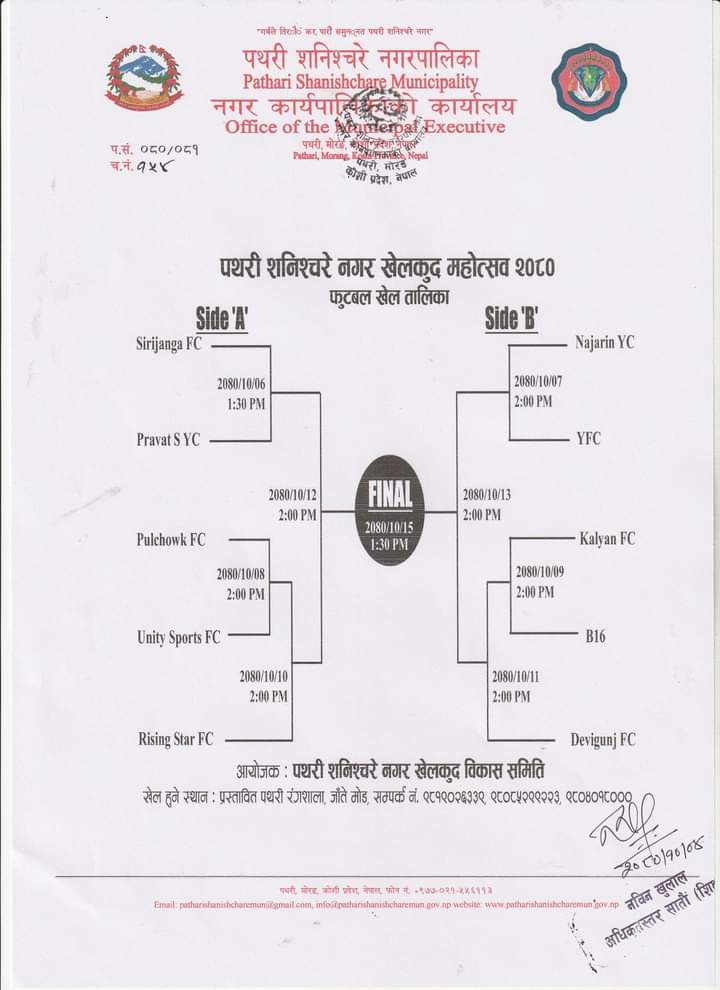नगरमा दर्ता भएको १० टिमले सहभागी रहेको खेल जातेमोडमा माघ १५ गतेसम्म जारी रहनेछ । प्रथम हुने टिमले १ लाख, दोस्रोले ५० हजार नगद, ट्रफी, मेडल पुरस्कर पाउनेछ । प्रतियोगितामा गोल्डेन बल, गोल्डेन बुट र गोल्डेन ग्लोव्सको व्यवस्थापन गरिएको छ ।