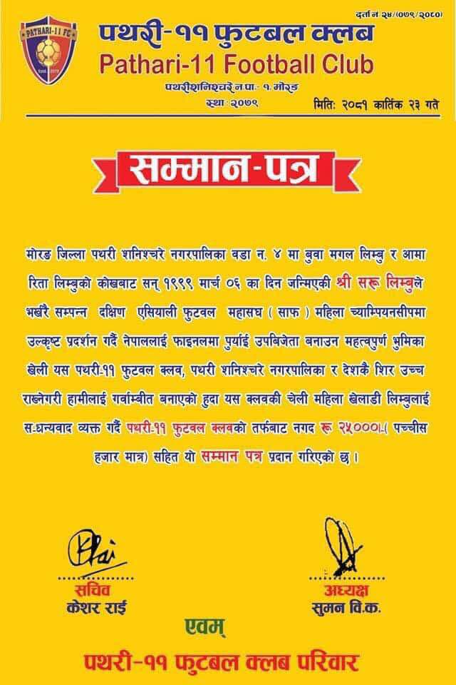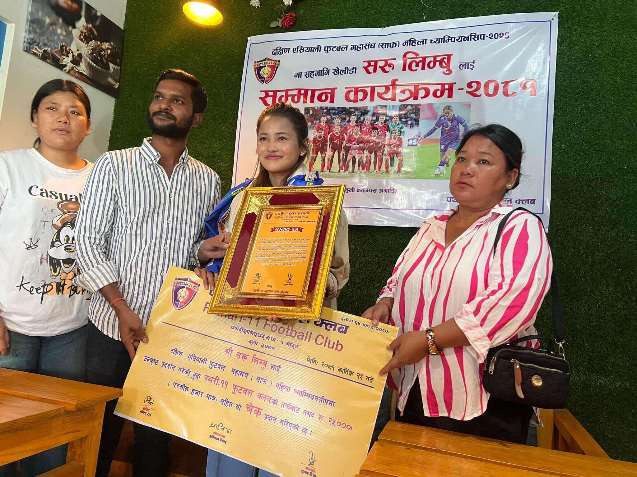 पथरी । नेपाली राष्ट्रिय महिला फुटबल टोलीकी मिडफिल्डर सरु लिम्बू गृहनगर पथरी शनिश्चरेमा सम्मानित भएकी छिन् ।