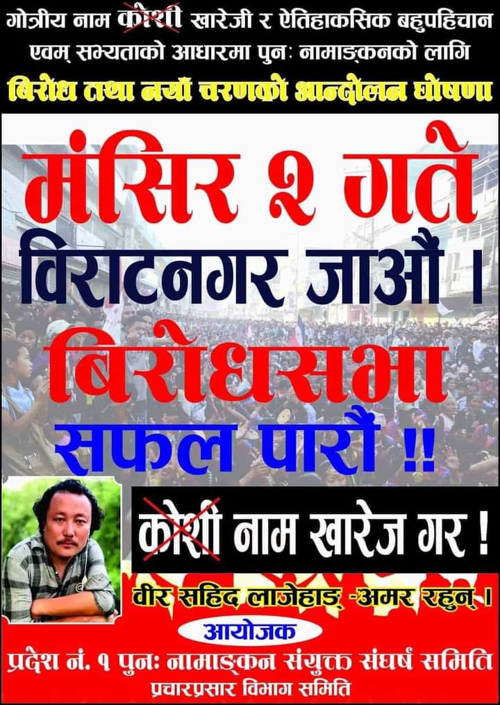 विराटनगर । प्रदेशको नाम कोशी विरुद्धमा आन्दोलनरत प्रदेश नं. १ संयुक्त संघर्ष समितिले आइतबार (मंसिर २) ‘नयाँ चरणको आन्दोलन घोषणा तथा कोशी नाम विरुद्ध विरोध प्रदर्शन’ गर्ने भएको छ ।