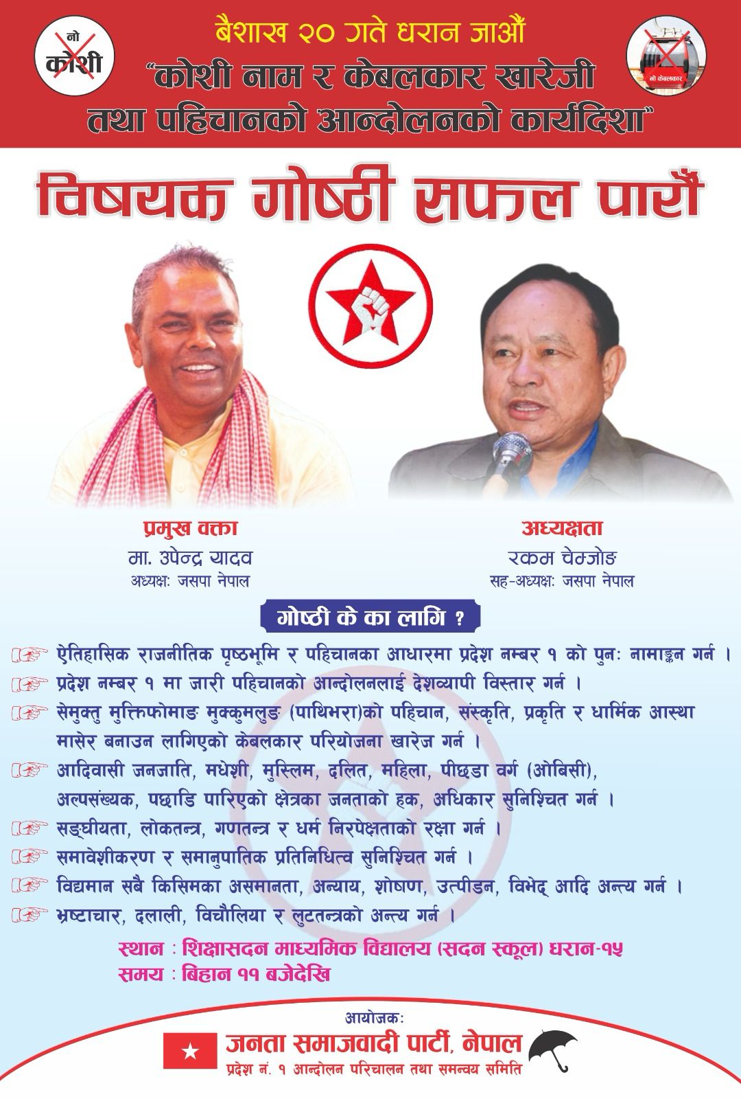 ‘पार्टीले कोशी नाम स्वीकार्न नसक्ने स्पष्ट धारणासहित आफ्नो विषय राख्दै आएको हो । त्यसैले कोशी नाम खारेज गरेर पहिचानको आधारमा प्रदेशको पुनः नामाङ्कनका लागि भइरहेको आन्दोलनमा हाम्रो सक्रिया सहभागिता रहँदै आएको छ’, गोष्ठीको प्रचार प्रसार संयोजक एवम् जसपा नेपालका केन्द्रीय सदस्य कमन देवान भन्छन् ‘नो कोशी र नो केबलकार आन्दोलन उठिरहेको छ, तर राजनीतिक रूपले यसलाई सम्बोधन गर्ने प्रयास अझै पनि भैरहेको छैन । यो गोष्ठीमार्फत त्यसतर्फ दबाब पुग्छ भन्ने हो ।’
